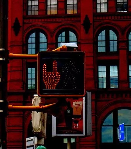 后現(xiàn)代藝術(shù)家設(shè)計(jì)的交通信號(hào)燈,綠色樹葉不僅是前進(jìn)的意思,而且在這個(gè)圖示中還有一個(gè)誘惑性的字母A,含義極為深刻,引人深思。