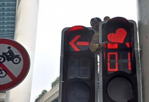2011年5月9日,位于上海延安西路中山西路路口的某個(gè)紅燈呈現(xiàn)愛(ài)心形狀,這個(gè)個(gè)性信號(hào)燈受到網(wǎng)友熱捧。9日中午,相關(guān)施工人員將蒙在紅燈上的愛(ài)心蒙版摘取下來(lái)。